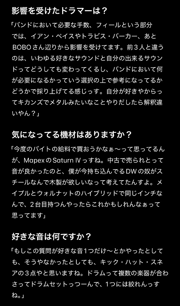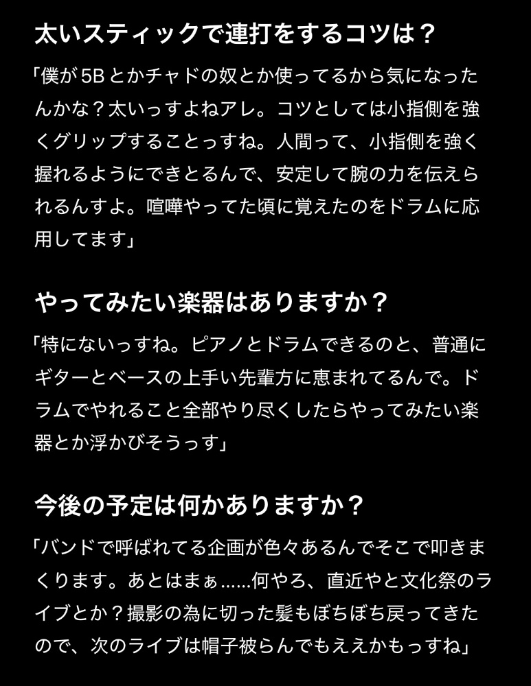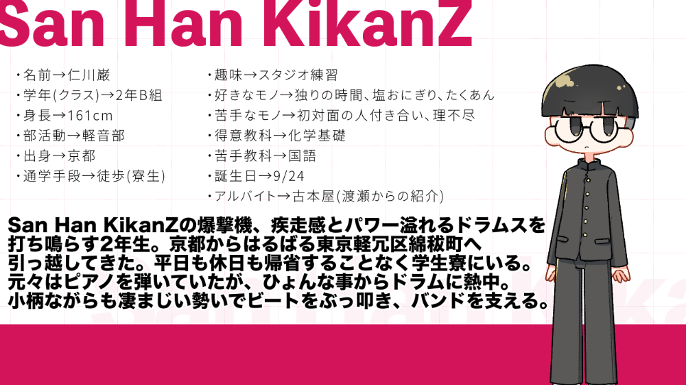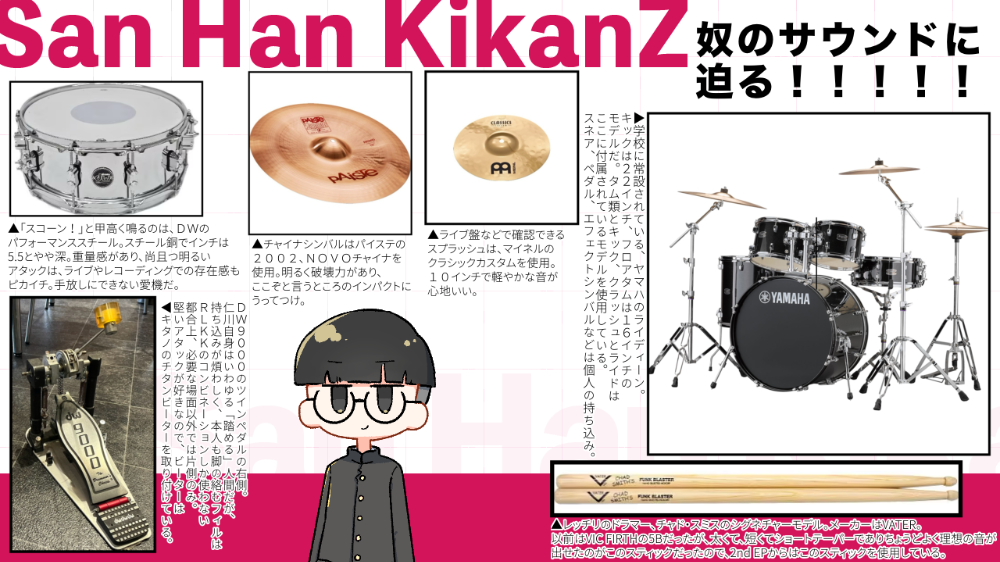 San Han KikanZの基盤となる爆撃機ドラムの持ち主です。メンバーの中で唯一の2年生。